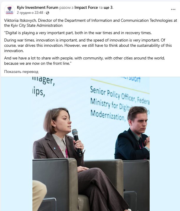 На форумі виступила й директор Департаменту інформаційно-комунікаційних технологій КМДА Вікторія Іцкович. Цитуємо: