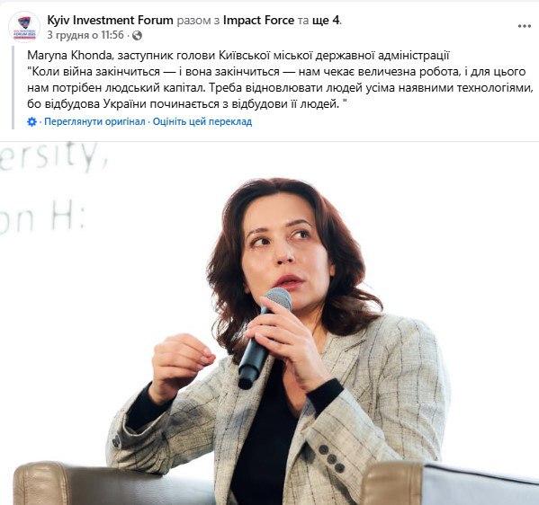 На цій же інтернет-сторінці форуму є коротка інформація про виступ заступника голови КМДА Марини Хонди. Ось що сказала Марина Хонда, цитуємо: