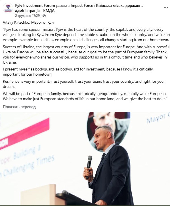 А ще Кличко повторив свою улюблену фразу, що він є «охоронцем інвестицій». Він періодично про це говорить.