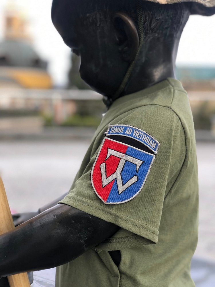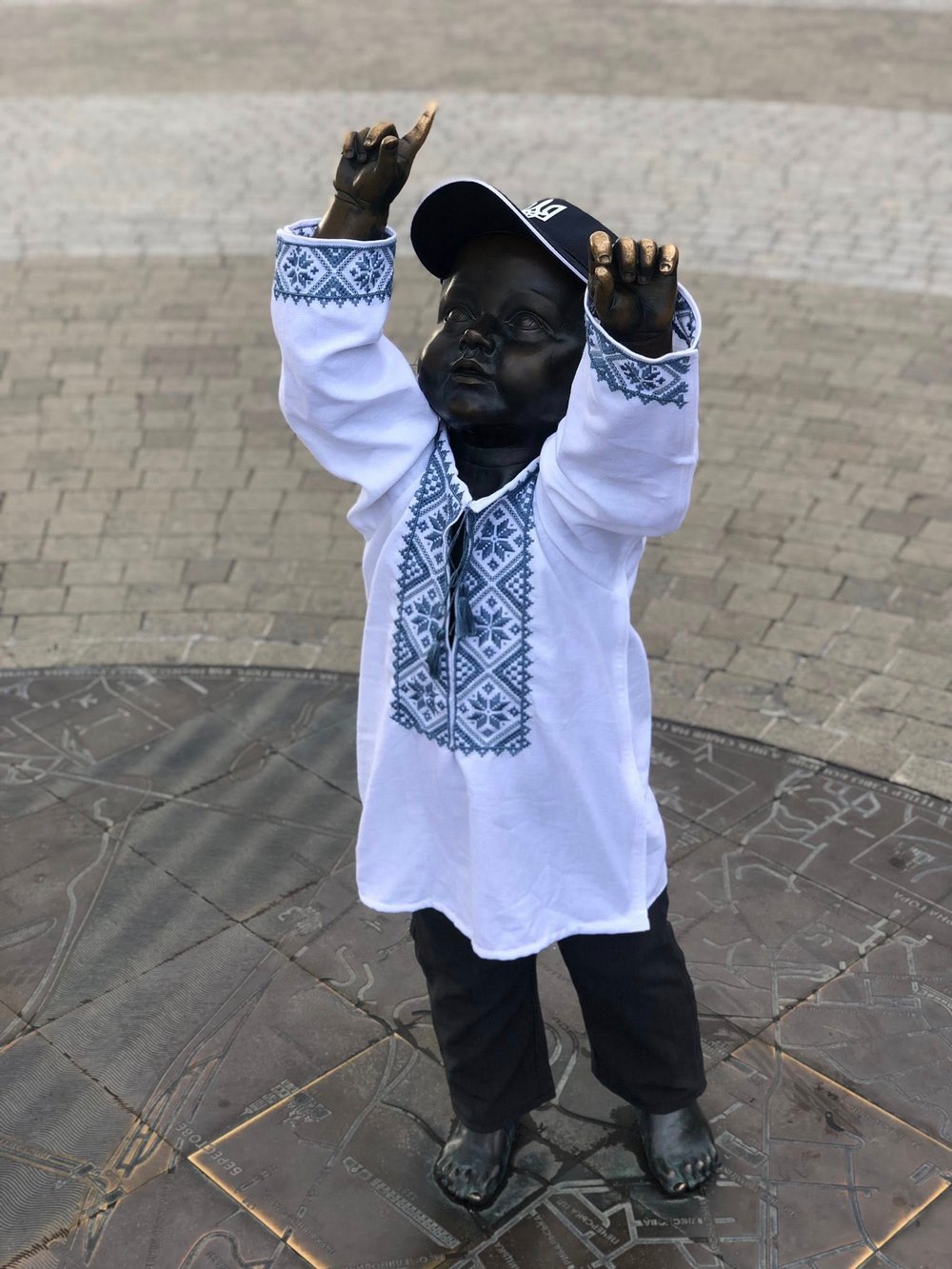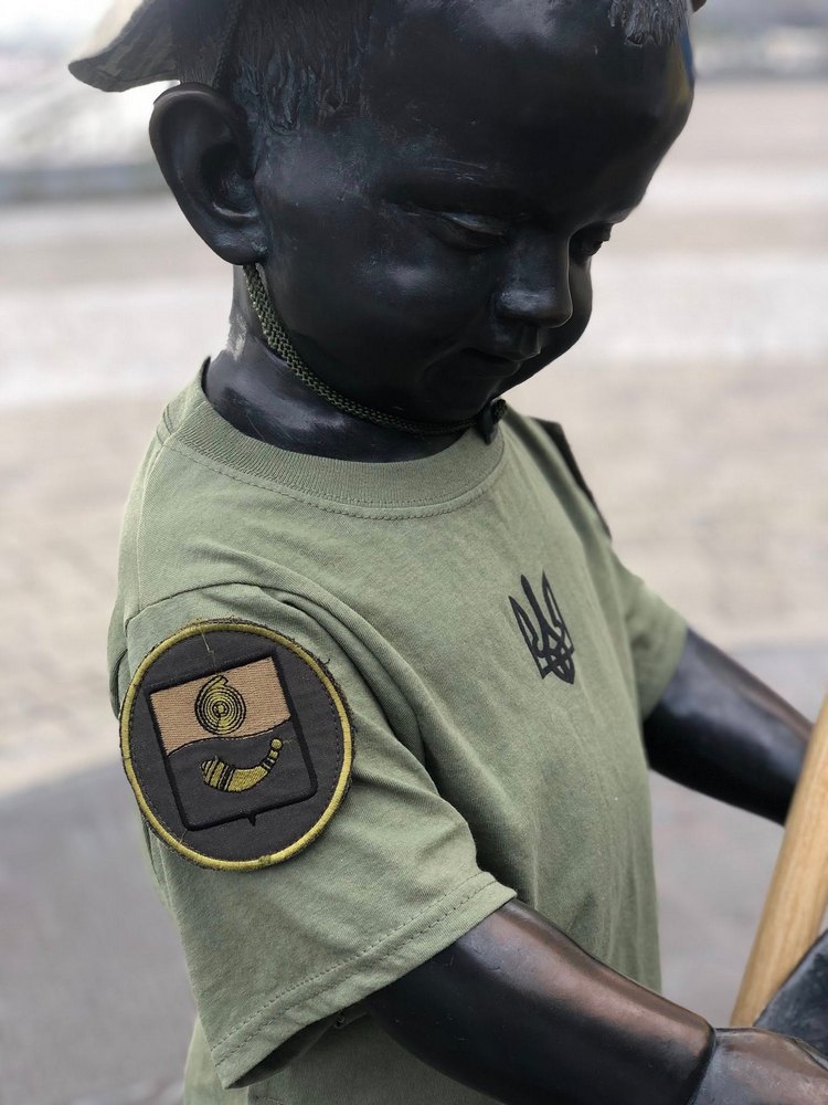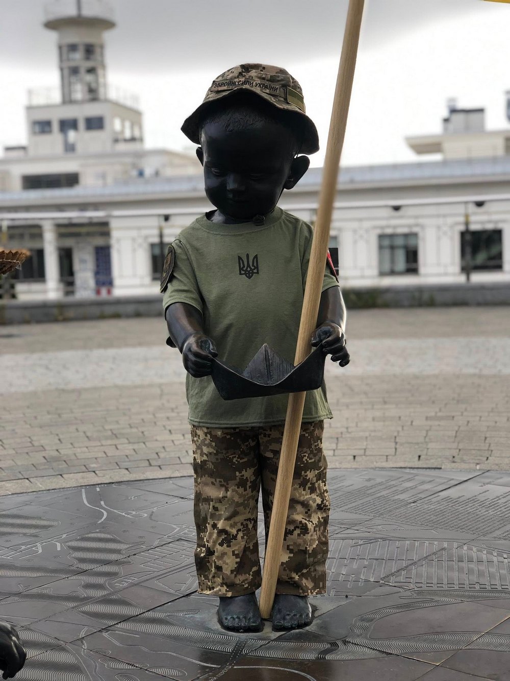 Щек з нагоди свят отримав вбрання військового з шевронами підрозділів, де служать брати скульптора Дмитро та Руслан.
