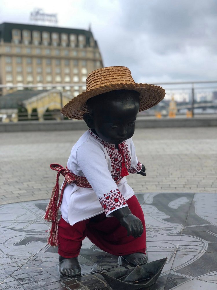 З нагоди Дня Державного прапора і Дня Незалежності України скульптури малюків-засновників Києва, розташовані на Поштовій площі, традиційно отримали новий святковий одяг.
