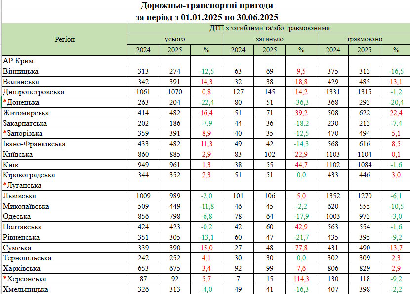 Згідно з нещодавно оприлюдненою статистикою, загалом в Україні за перше півріччя 2025 року в ДТП загинуло 1367 людей і ще 13895 отримали травми. Трійку «лідерів» за кількістю дорожньо-транспортних подій очолює Дніпропетровська область – 1070 аварій, у яких загинуло 145 людей і 1315 було травмовано. Друге місце посідає Львівщина – 989 ДТП з 106 загиблими та 1270 травмованими. На третьому місці цього антирейтингу опинився Київ із 961 дорожньо-транспортною подією, внаслідок яких загинуло 55 людей і ще 1084 отримали травми.