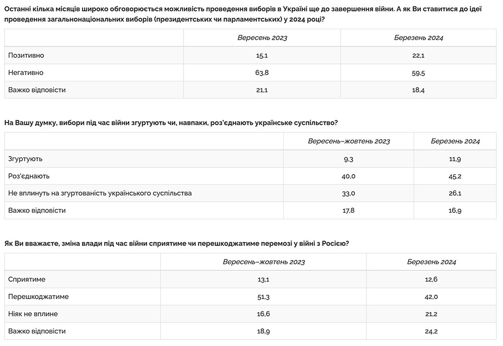 За результатами соцопитування, лише 22 відсотки респондентів позитивно ставляться до ідеї проведення загальнонаціональних виборів в Україні (президентських чи парламентських) до завершення війни (хоча це дещо більше, ніж було у вересні 2023року — 15%). Більшість опитаних (59,5%) ставляться до цього негативно (у вересні 2023року — 64%).