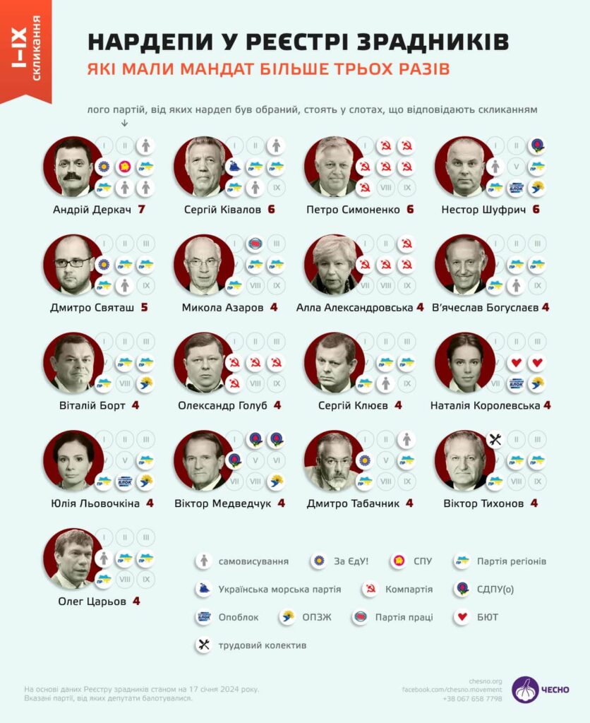 З’ясувалося, що з початку повномасштабного вторгнення до Реєстру зрадників потрапило майже 1370 осіб, із яких 96 — нардепи усіх скликань парламенту. Ще 36 нардепів обирали більше трьох скликань.