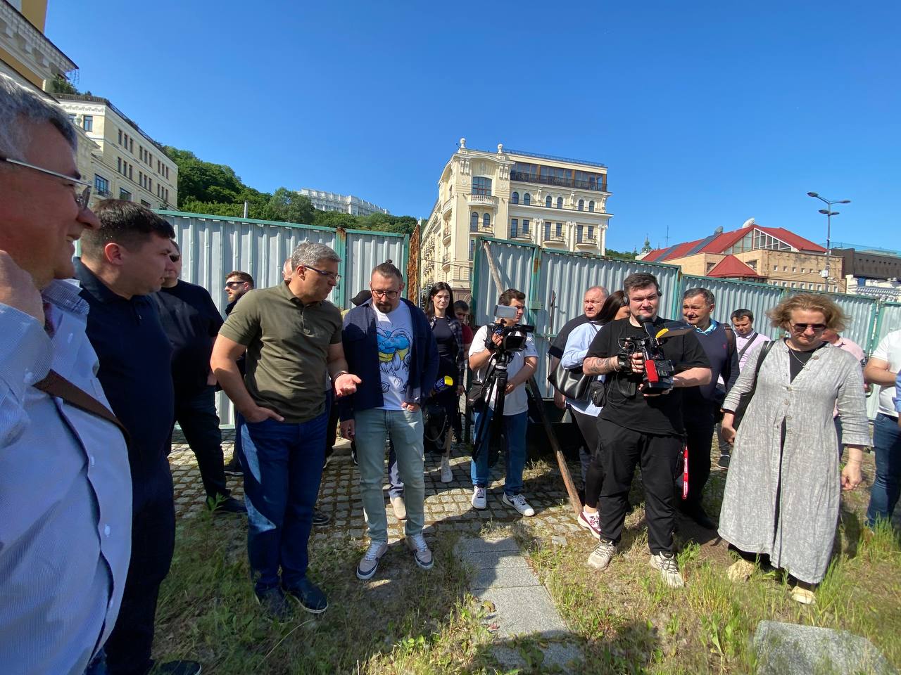 Як і було заплановано, народні депутати України, депутати Київської міської ради, представники КМДА, громадські активісти зібралися на Поштовій площі, аби перевірити, в якому стані перебуває станція метрополітену. Присутні розпочали огляд котловану.