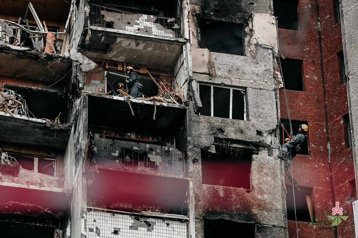 На місці влучання уламків ворожої ракети в будинок, що на вулиці Академіка Заболотного, в Голосіївському районі столиці, тривають роботи із ліквідації наслідків надзвичайної ситуації