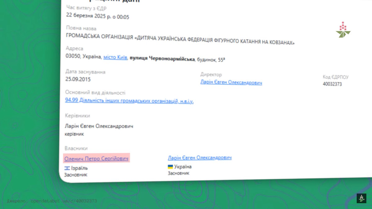 «Спершу вдалося натрапити на факт, який, здавалося б, не має стосунку до дерибану землі. Наприклад, в одному з реєстрів було знайдено людину з таким ж ім’ям — Петро Оленич — серед засновників громадської організації «Дитяча українська федерація фігурного катання на ковзанах». Цікава деталь, що тут і лише тут Петро Оленич вказаний як громадянин Ізраїлю», — розповіли журналісти.