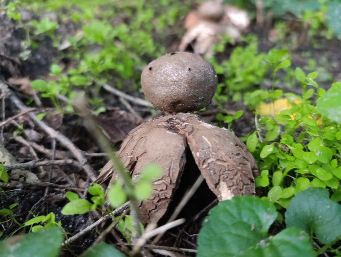 Як повідомляє адміністрація парку, це міріостома стовпчикова (Myriostoma coliforme), родич так званих «земляних зірок». Верхній шар його плодового тіла розкривається на «промені», які піднімають спорову кулю над землею, що робить гриб схожим на маленьку космічну станцію.