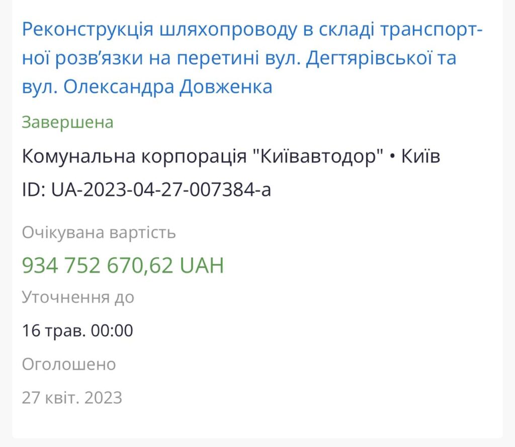 Є і конкретика. Як стало відомо виданню “KВ” з оголошення у Prozorro, 1 червня 2023 року «Київавтодор” уклав з ТОВ «Ростдорбуд» договір на реконструкціію шляхопроводу на 920 млн. грн.