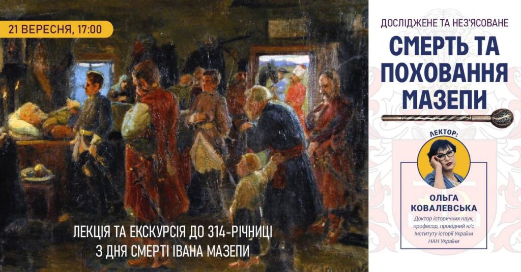 «Постать Івана Мазепи настільки видатна, що не лише історія його життя, вчинки та потаємні думки приваблюють дослідників, але й факт смерті та поховання. Навколо рокового дня існує безліч легенд та міфів, розвіювати які будемо під час лекції разом із доктором історичних наук, професором, провідним науковим співробітником Інституту історії України НАН України Ольгою Ковалевською», – повідомляє пресслужба Нацзаповідника.