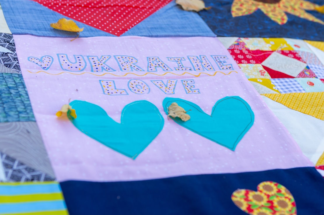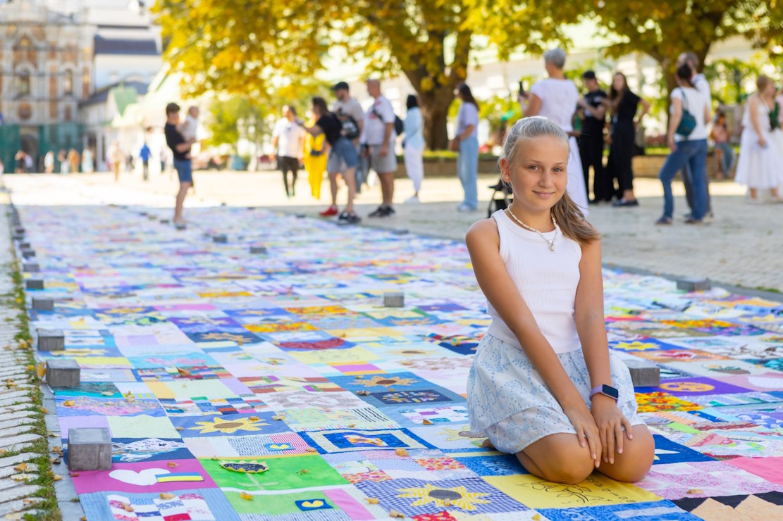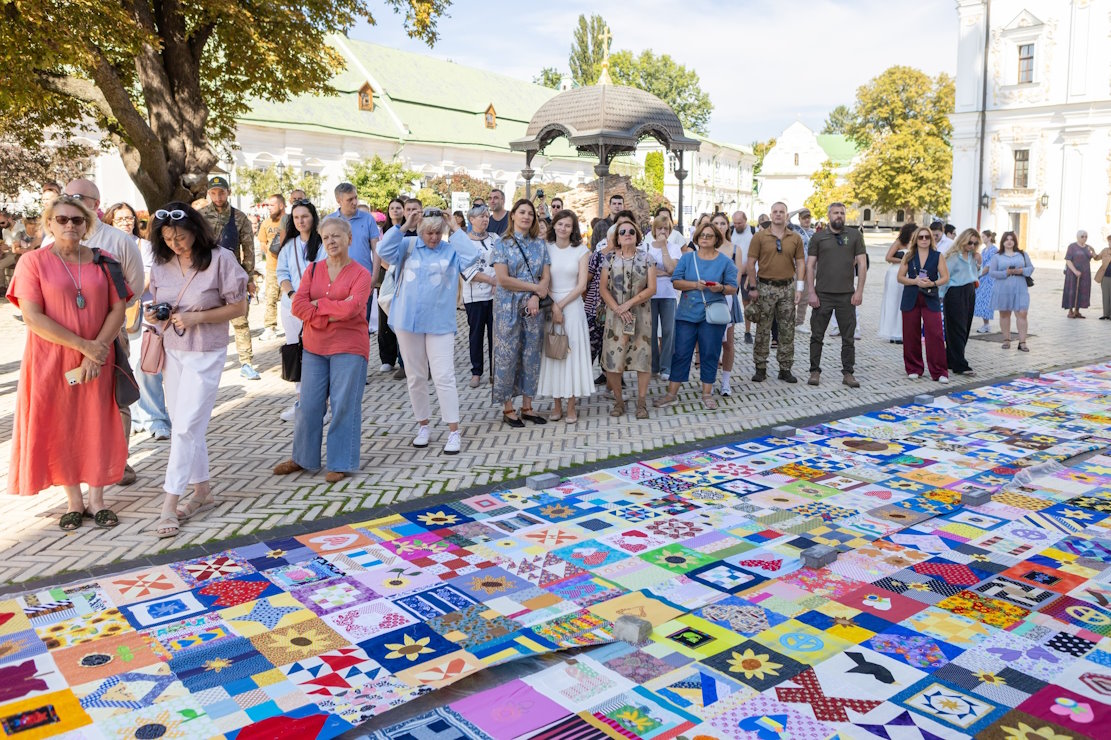 Біля Великої Лаврської дзвіниці розгорнули перші 600 метрів найбільшої в світі клаптикової ковдри «Sunflower Quilt For Ukraine – Печворк Перемоги».