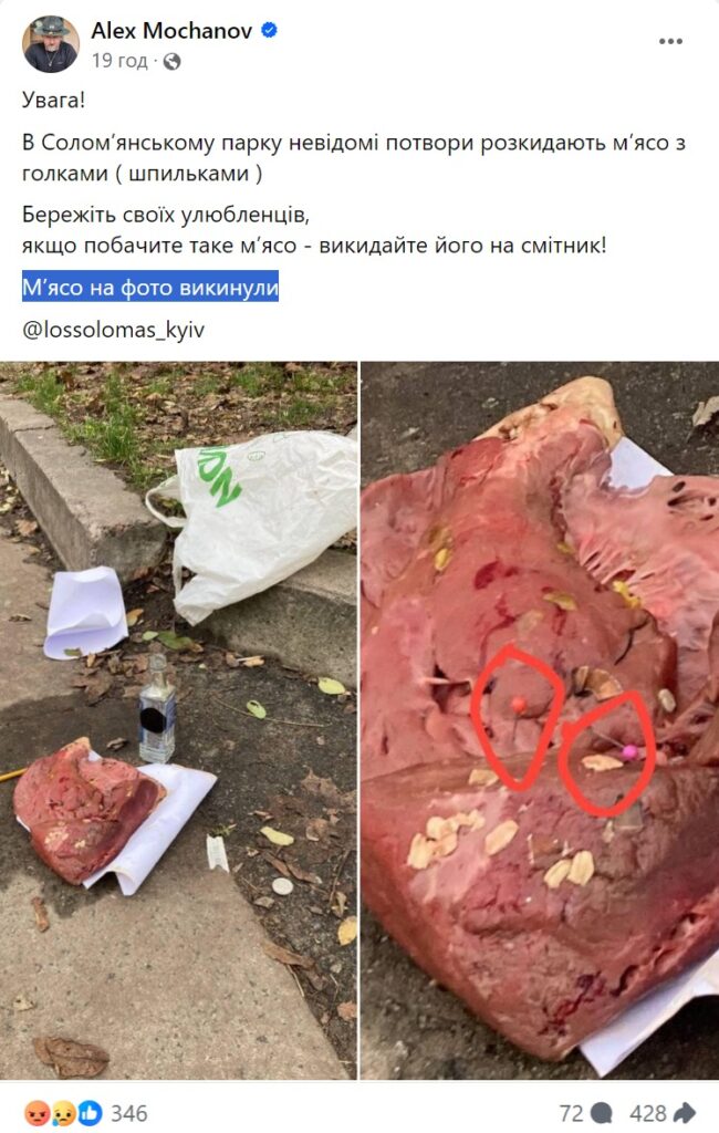 «Увага! В Соломʼянському парку невідомі потвори розкидають мʼясо з голками (шпильками). Бережіть своїх улюбленців, якщо побачите таке мʼясо – викидайте його на смітник!», – написав він на своїй сторінці у Facebook.