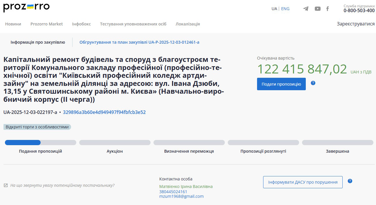 Згідно з тендерною документацією, ремонт стосуватиметься навчально-виробничого корпусу на вулиці Івана Дзюби у Святошинському районі столиці. За 122,4 млн грн протягом 13 місяців планують провести капітальний ремонт будівель і споруд із благоустроєм прилеглої території коледжу.