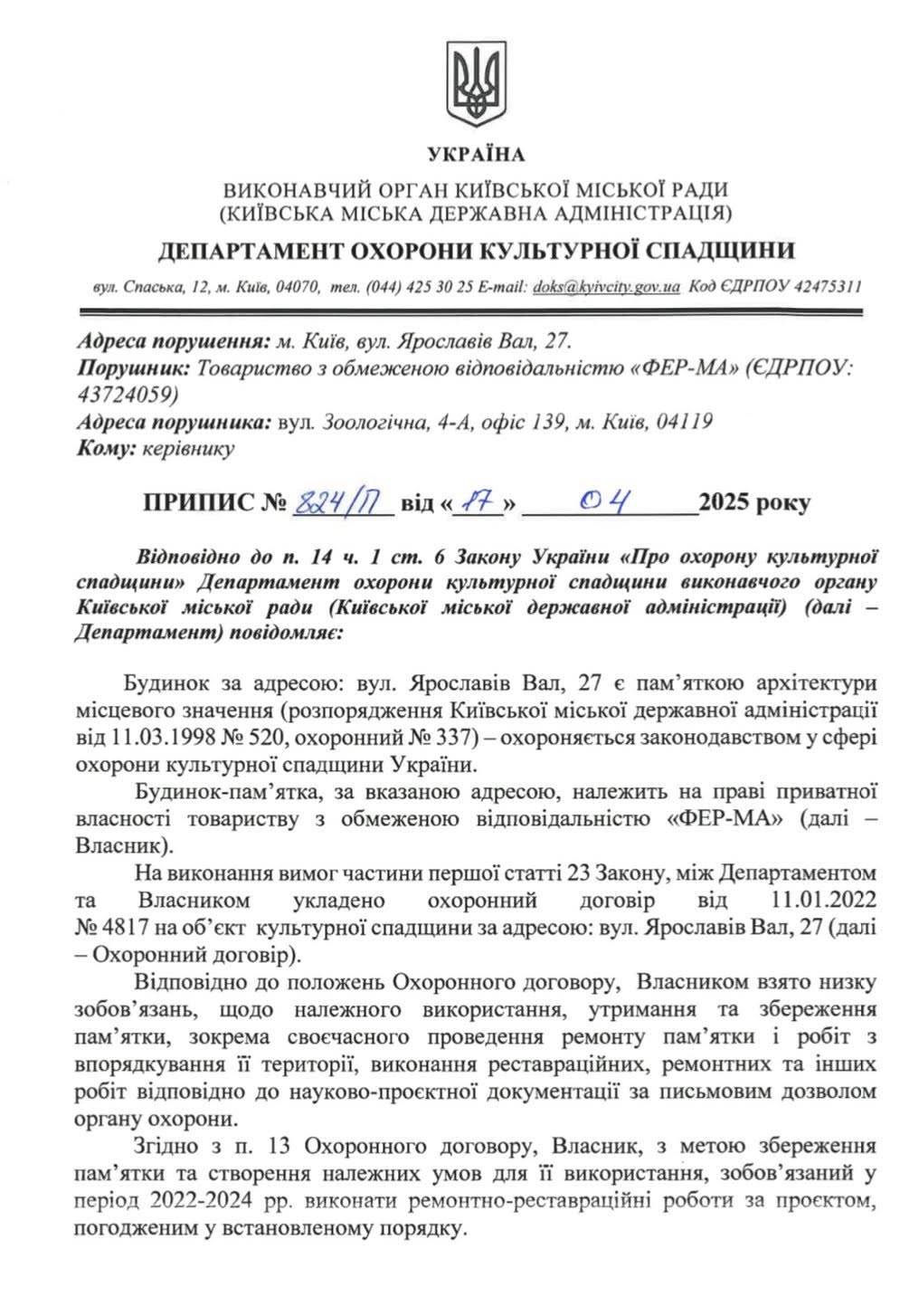 За його словами, все це відбувається на тлі відкритого кримінального провадження та відповідного припису Департаменту охорони культурної спадщини КМДА щодо неприпустимості дій, що псують архітектурний ансамбль будівлі.