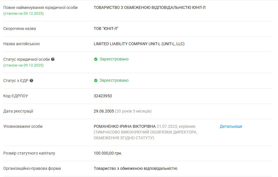 Що ж це за фірма, «Юніт-л»? За даними аналітичної системи Youcontrol, зареєстрована в 2005 році. Засновником та кінцевим бенефіціаром є мешканець села Велика Стариця Бориспільського району Київської області Олександр Корнута, директором – Ірина Романенко. Статутний капітал – 100 тисяч гривень.