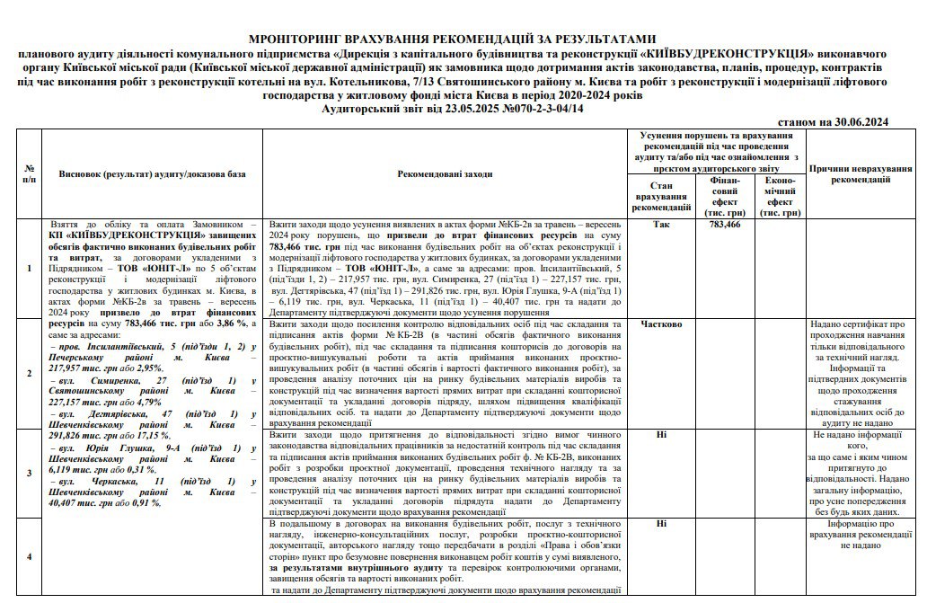 Аудитори проаналізували інші угоди про ремонт ліфтів. І тут також суцільні порушення. Є завищення обсягів фактично виконаних будівельних робіт та витрат за договорами, укладеними з підрядником – ТОВ «Елевейтор сервіс» (йдеться про грудень 2023 року – травень 2024-го). Фірма поліпшувала ліфти за п’ятьма адресами. Це «поліпшення» призвело до втрат фінансових ресурсів на суму 1 431,104 тис. грн.
